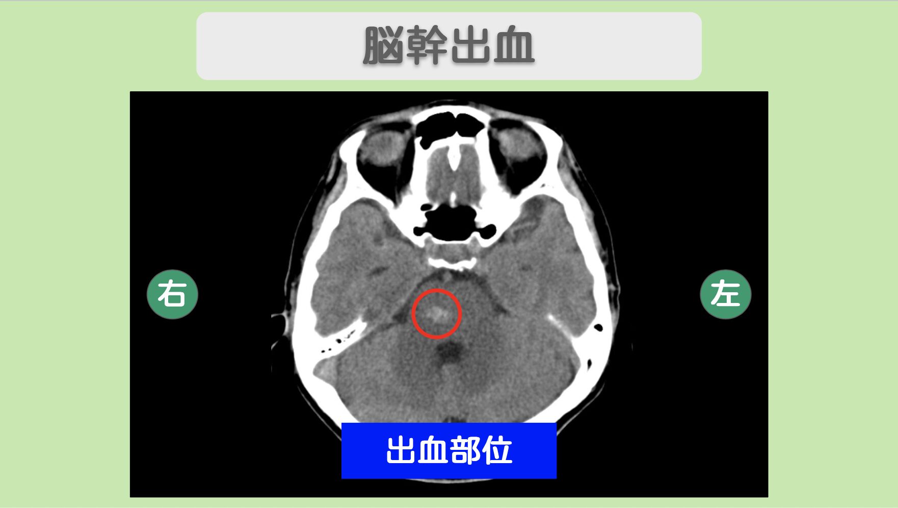 脳幹(橋〜中脳付近)に小さな高吸収域(白く映っている部分)が認められます