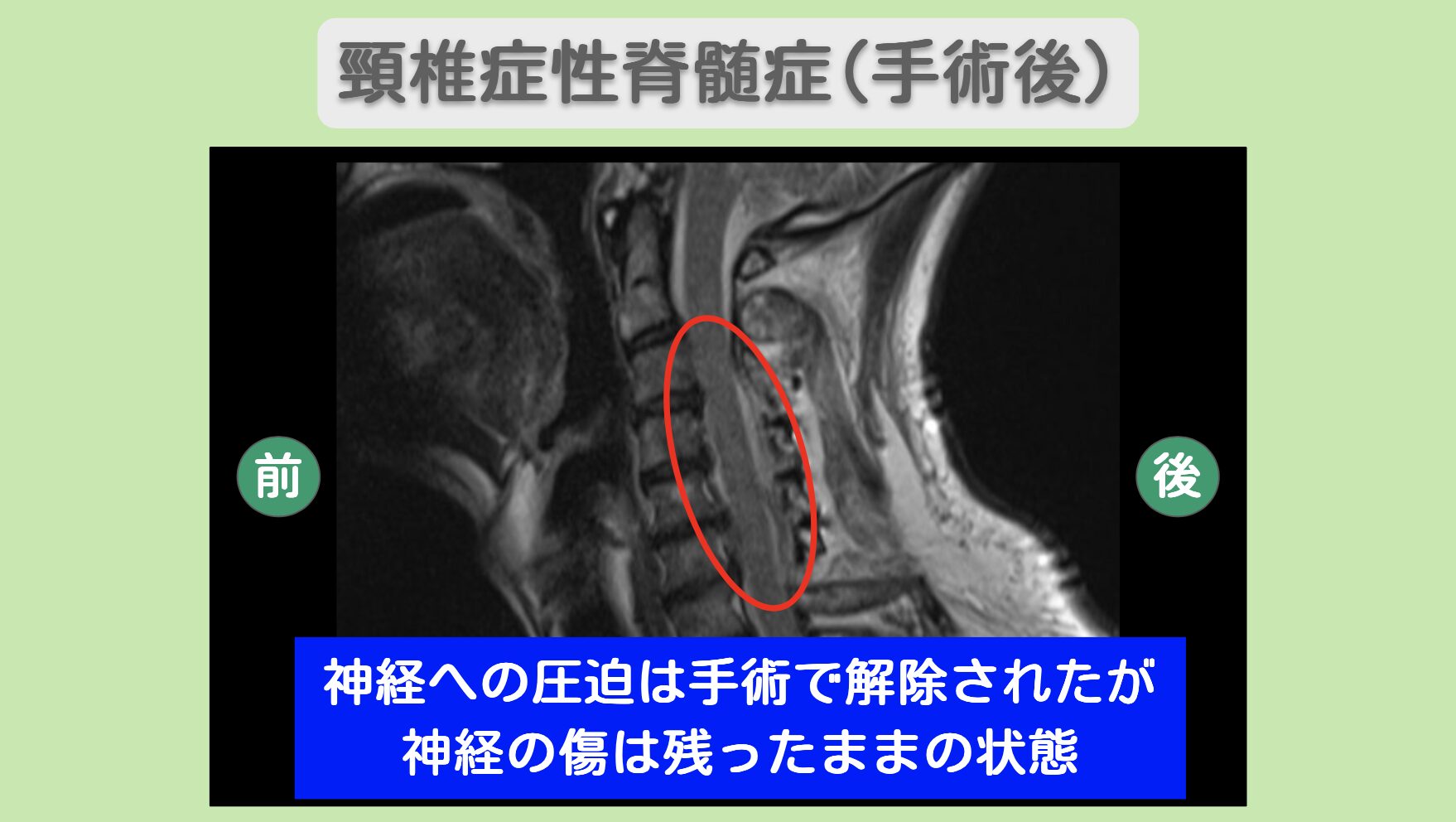 MRIにて脊髄の手術後に圧迫が解除されていることが分かります。しかし、神経は傷が残った状態のままです。